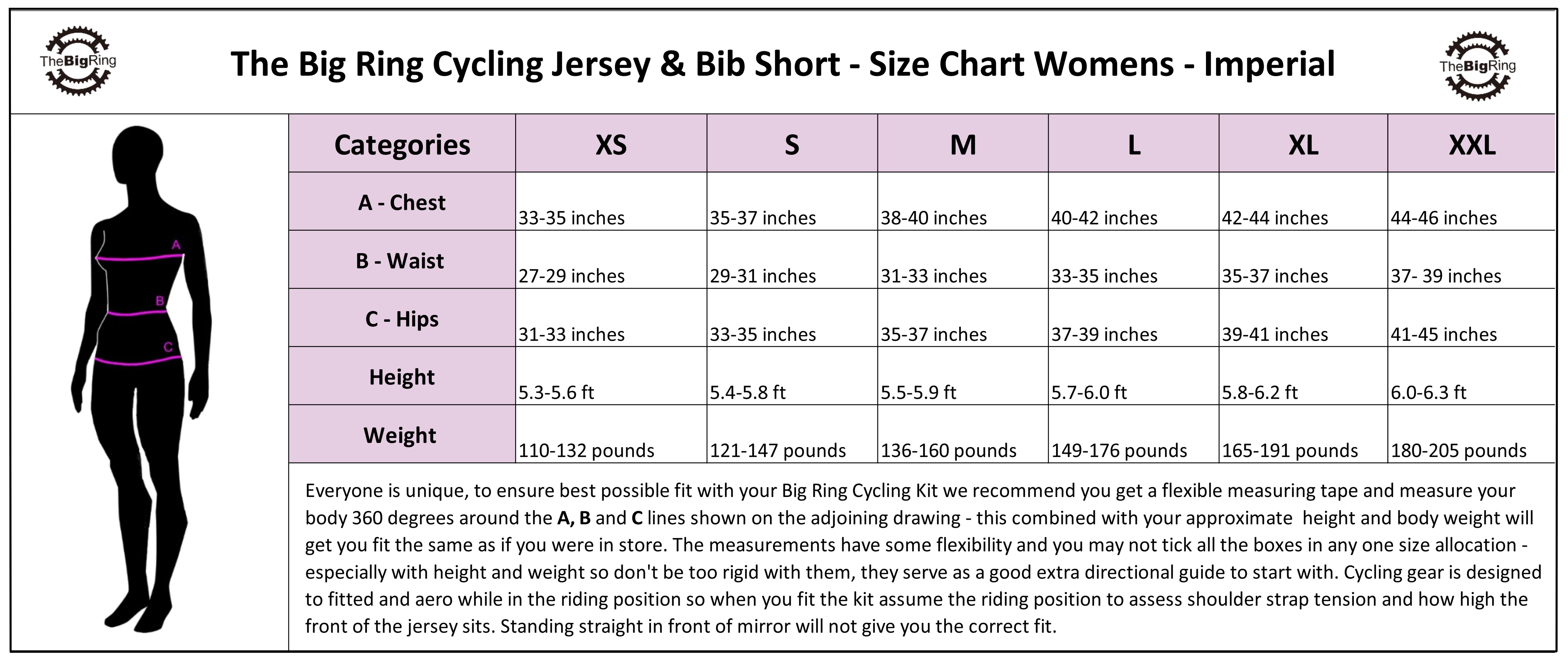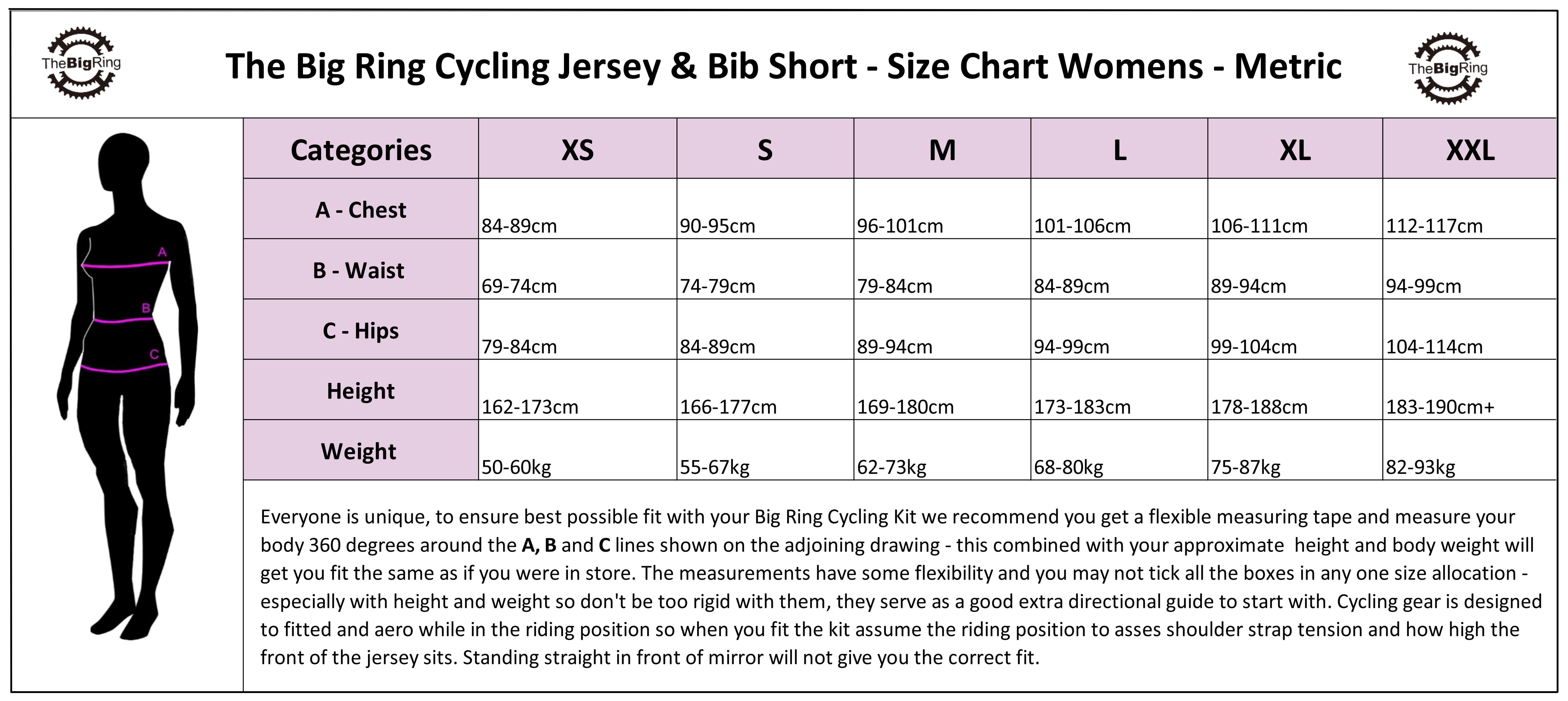 Temperature Range – The Big Ring Jersey Range willwork in temperature 15°- 37°Degrees Celsius, the comfort level will vary of course with intensity level of your workout and the climate/temperature that you operate in, layer with appropriate base layers for hotter or colder conditions for improved thermal control. Outer Layers are required for colder conditions starting with cycling vest, then arm warmer and legwarmers for conditions in the 7°- 14°degrees Celsius. Temperatures below 7°degrees Celsius we recommend cycling booties, full length thermal cycling bib shorts, thicker warmer base layers and high quality breathable shell jackets and vest. In extreme heat conditions 30 Celsius plus Lightweight Sun Protection Sleeves can be beneficial for cooling and sun protection.  This is rough guide everyone has unique needs, just remember layering gives you options.